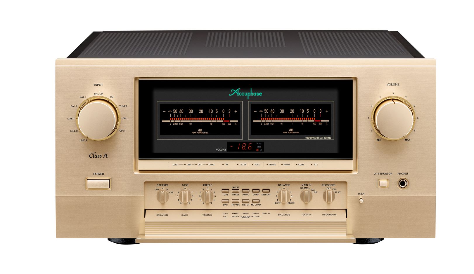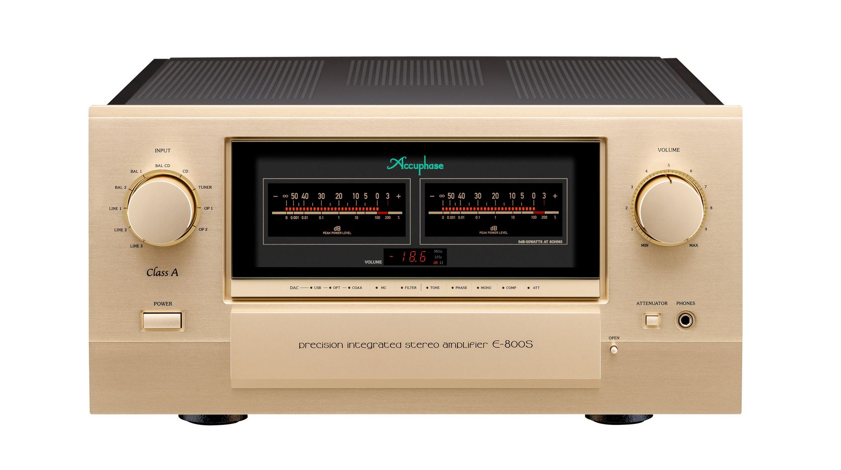 Der Vollverstärker E-800S ist das neue Flaggschiff unter den integrierten Class-A Accuphase Verstärkern. Sein Qualitätsniveau und seine umfangreiche Ausstattung sind ohne Weiteres mit dem getrennter Komponenten der Spitzenklasse vergleichbar! Im Vorverstärkerteil des E-800S kommt die erneut verbesserte „Balanced AAVA“- Lautstärkeregelung zum Einsatz. Die Lautstärkeregelung erfolgt feinfühlig über einen von Accuphase entwickelten Sensormechanismus, der aus einem einzigen massiven Aluminiumblock gefräst wurde. Die mächtigen mit MOS-FET Leistungstransistoren bestückten, Class-A Endstufen können mit einer Ausgangsleistung von 2x 50Watt aufwarten. Zur optimalen Betriebssicherheit sind die Endstufenmodule auf hoch effiziente Kühlkörper montiert. Die Spannungsversorgung des E-800S erfolgt über ein großzügig dimensioniertes Netzteil mit einem massiven Netztransformator und 63.000 μF Siebkondensatoren, diese sorgen für höchste Stabilität. Der hohe Dämpfungsfaktor des E-800S von 1000 unterstreicht dieses eindrucksvoll. Der reichhaltig ausgestattete Verstärker bietet überdies zwei Steckplätze für analoge und digitale Optionsplatinen sowie drei symmetrische Eingänge.